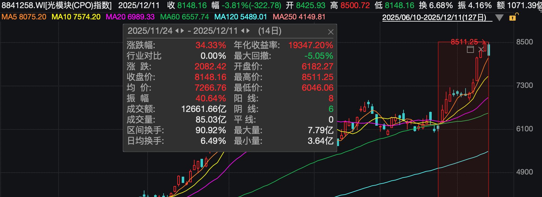 11月24日以来,光模块(CPO)板块成为了A股市场当之无愧的领涨先锋——截至12月11日,Wind光模块(CPO)指数在短短14个交易日内累计涨幅近35%。