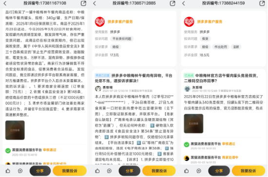 在黑猫投诉【下载黑猫投诉客户端】平台上,中粮梅林差评不断,“食品安全”频遭投诉。
