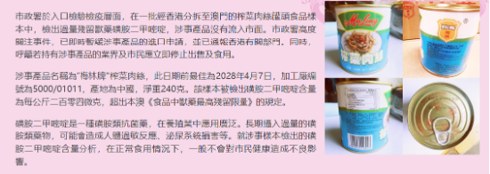 日前,澳门市政署通报:因磺胺二甲嘧啶残留量超标,暂缓“梅林牌”榨菜肉丝罐头的进口。涉事产品未流入澳门市面,香港开展全面下架回收工作。据悉,磺胺二甲嘧啶属兽药范畴,长期过量摄入可能引发人体过敏反应、泌尿系统损害等健康风险。