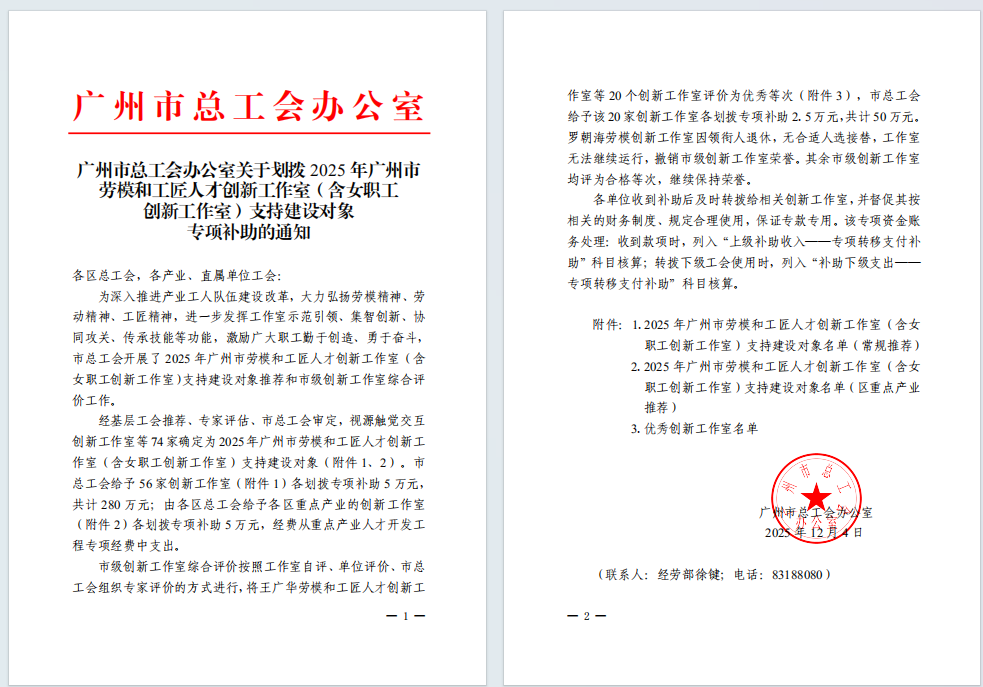近日,广州市总工会公布了2025年广州市劳模和工匠人才创新工作室(含女职工创新工作室)支持建设对象及优秀等次名单。广电计量两大创新工作室喜获佳绩。其中,“陆裕东工匠人才创新工作室”被确定为市级支持建设对象,“张兰兰女职工创新工作室”获评市级“优秀创新工作室”。这两项荣誉,是对广电计量在产业工人队伍建设与技术创新领域长期投入与实践成效的积极肯定。