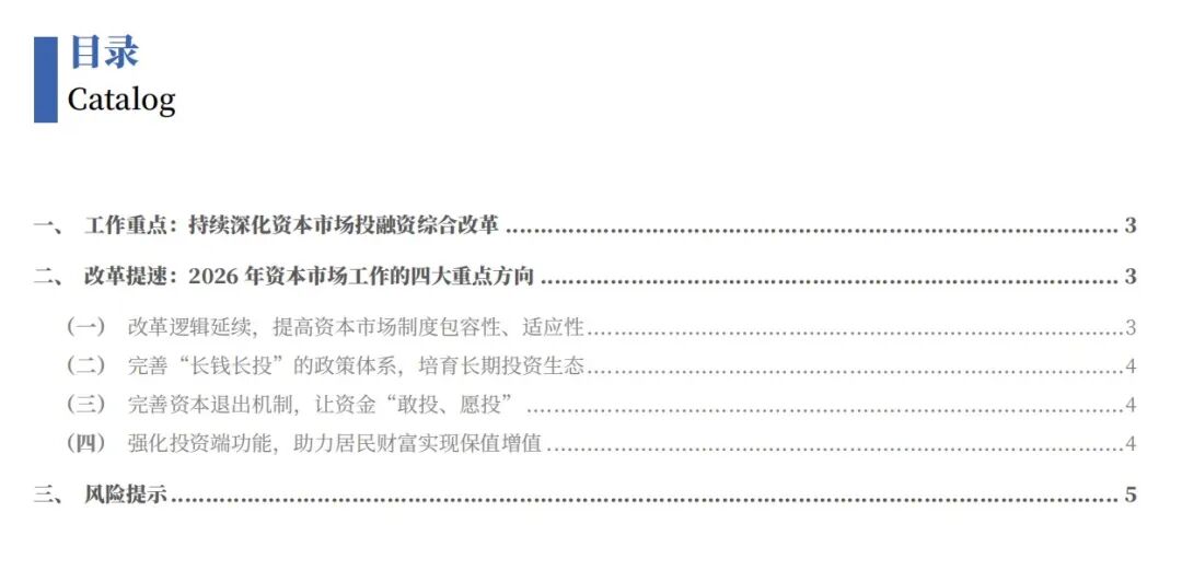 2026年是“十五五”规划的开局之年,更是资本市场高质量发展的奋进之年。近年来,中央经济工作会议中关于资本市场议题的权重和重要性提升。2023年新质生产力概念提出以来,成为经济增长的新动能,科技创新的重要性进一步增加。2021—2023年,中央经济工作会议通稿未单独提及资本市场这一关键词,但2023年,在“支持科技”的部分,强调“鼓励发展创业投资、股权投资”,作为支持科技创新的关键融资渠道加以阐述;2024年和2025年,资本市场相关任务部署在“支持科技”和“改革”两个部分均被明确提出,政策关注度显著提升。2026年持续深化资本市场投融资综合改革是资本市场工作的重中之重,更是资本市场赋能新质生产力、推动高质量发展的关键抓手。