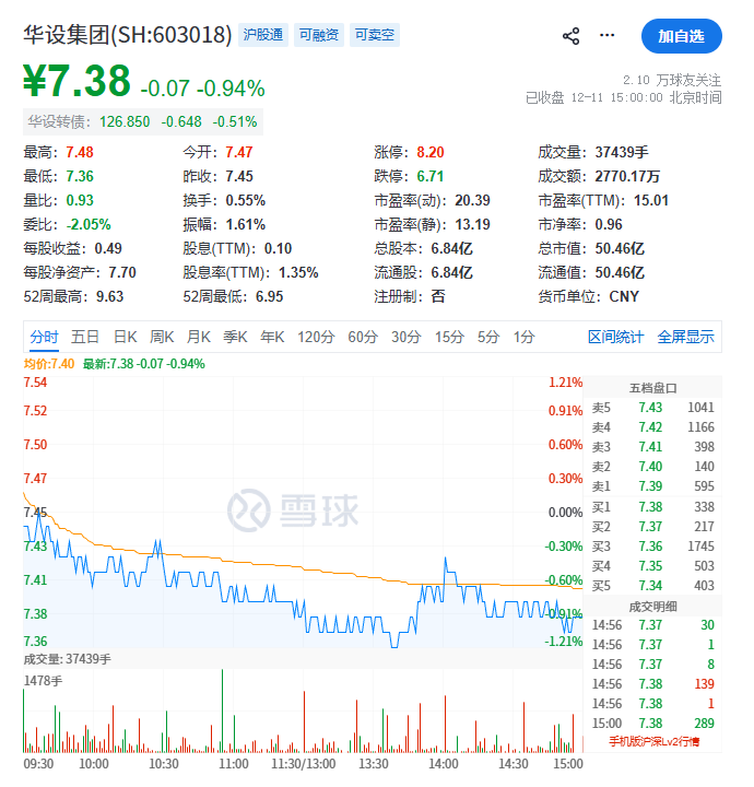 二级市场上,截至12月11日收盘,华设集团跌0.94%,报7.38元/股,总市值50.46亿元。