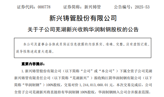 12月11日晚,新兴铸管(000778)公告称,下属全资子公司芜湖新兴铸管有限责任公司(下称“芜湖新兴”)拟收购江阴华润制钢有限公司(下称“华润制钢”)100%股权,交易对价12.44亿元。本次收购芜湖新兴资金来源为公司自有资金和自筹资金。
