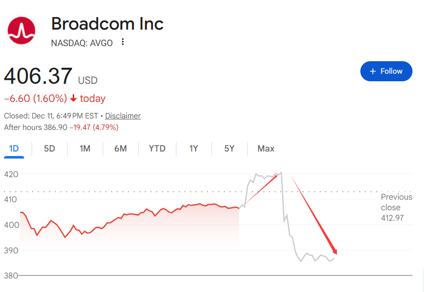 博通公布的AI市场销售前景未能满足投资者的高期望值,盘后股价转跌。