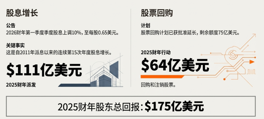 2025财年,我们通过111亿美元的股息和64亿美元的股票回购及注销,向股东返还了175亿美元的现金。与我们在前一年产生更多现金流的能力相一致,我们宣布在2026财年第一季度将季度普通股现金股息提高到每股0.65美元,较上一季度增长10%。我们打算在整个2026财年维持这一目标季度股息,但这需经董事会每季度批准。