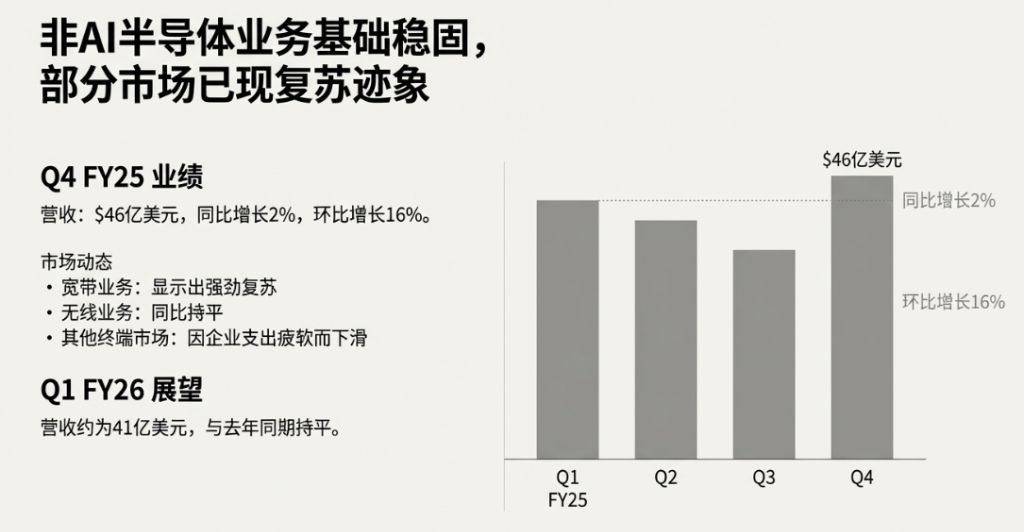 非AI半导体业务第四季度收入为46亿美元,同比增长2%,环比增长16%,主要得益于无线业务的季节性利好。