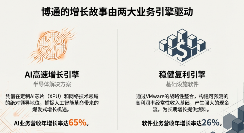 - 业绩创下历史新高:2025财年,公司总收入同比增长24%,达到创纪录的640亿美元,主要由AI、半导体和VMware业务驱动。其中,AI业务收入同比增长65%,达到200亿美元。