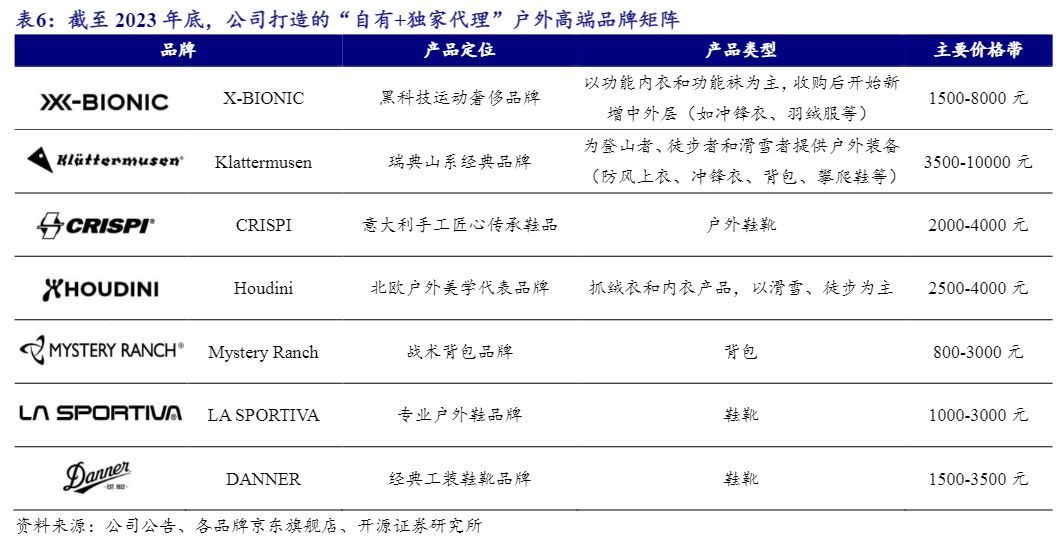 目前,公司已打造出自有高端运动黑科技品牌X-BIONIC、合资瑞典山系经典品牌Klättermusen、独家代理CRISPI、经典工装鞋靴DANNER、战术背包Mystery Ranch、专业户外鞋LA SPORTIVA、北欧户外美学代表Houdini品牌矩阵。