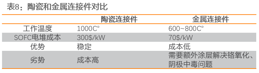 SOFC包含由连接件间隔开的多个燃料电池,连接件用于邻近电池之间的电连接。连接件是SOFC系统中价值量最高的零部件,成本占比达一半以上。根据材料不同,可分为陶瓷连接件和金属连接件。陶瓷连接件的成本较高。根据原材料成本测算,采用陶瓷连接件的平板式SOFC电堆成本高达300$/kW。若采用金属连接件,成本可降至70$/kW。