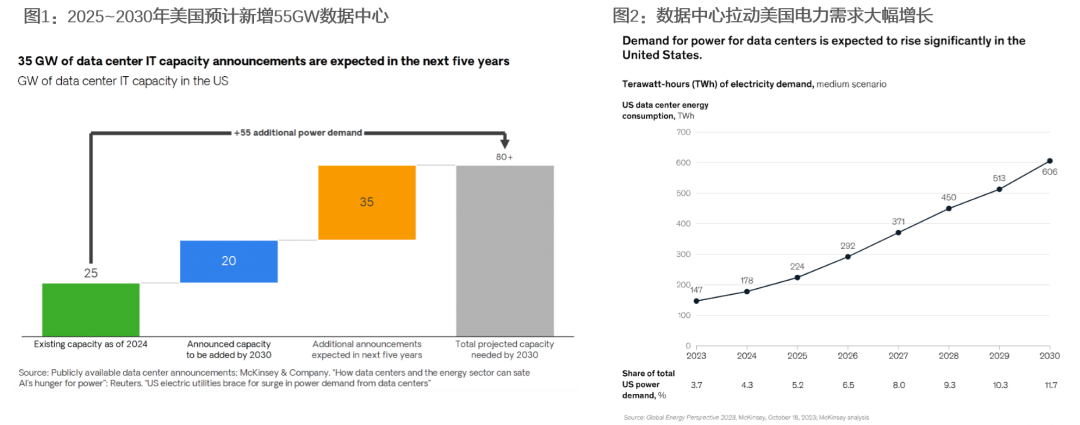 2024年美国在运数据中心规模25GW,2030年预计超80GW。根据McKinsey预测,美国2025~2030年将新投运55GW数据中心。其中包括已经公告的20GW项目,未来5年还会有至少35GW数据中心项目陆续公布,以满足AI日益增长的数据需求。