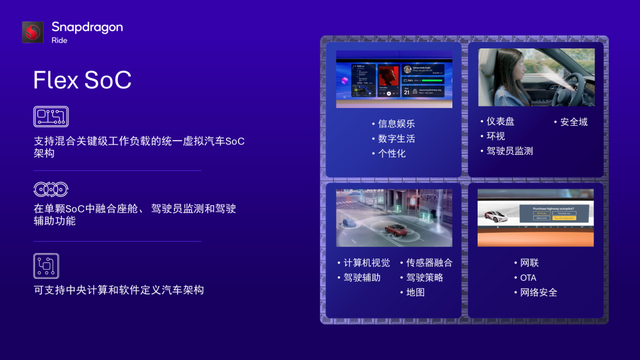 随着汽车智能化水平的持续提升,汽车行业正朝着以架构优化和系统协同为核心的方向发展。舱驾融合作为迈向多域融合乃至中央计算的重要环节,不仅推动电子电气架构从分布式向集中式演进,也为软件定义汽车架构的构建铺垫了清晰的技术路径。高通公司作为智能汽车技术创新的赋能者,于2023年国际消费电子展(CES)上推出了行业首款同时支持智能座舱与先进驾驶辅助系统(ADAS)的可扩展平台——Snapdragon Ride Flex SoC(骁龙8775)。