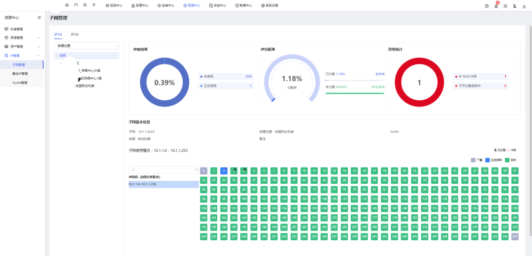 可视化台账:通过交互式图表展示IP地址分配率、使用率及空闲资源,为网络规划提供精准数据支撑。