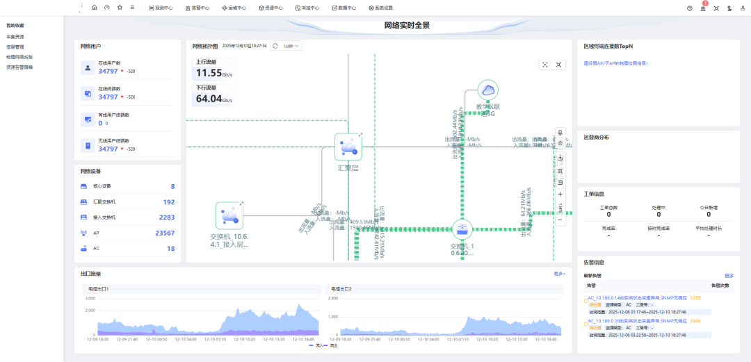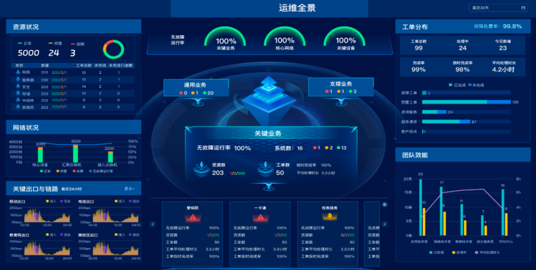 四网融合监控大屏:在同一视图中实时展示有线设备性能、无线AP状态、出口带宽利用率及光网络链路质量。