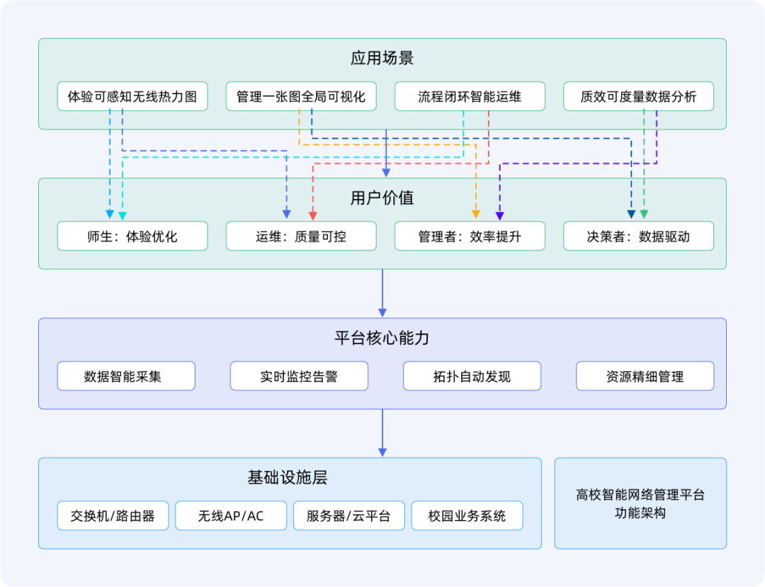 传统困境:高校有线、无线、出口、光网络分别由不同系统监控,数据孤岛严重,无法全局掌握网络健康状态。