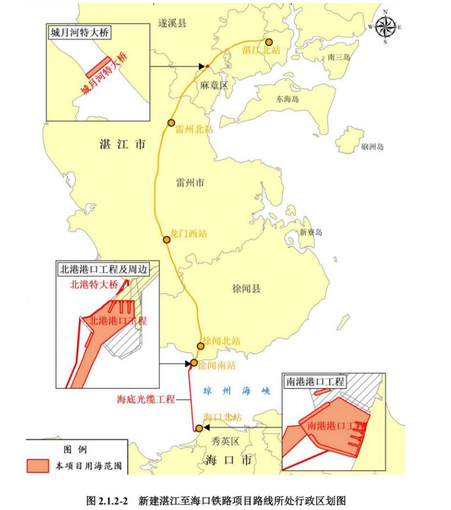 项目在城月河及琼州海峡周边海域涉及用海,具体涉海工程有城月河特大桥、北港特大桥、北港港口工程、南港港口工程及海底光缆工程5部分,项目建设单位为海南铁路有限公司。