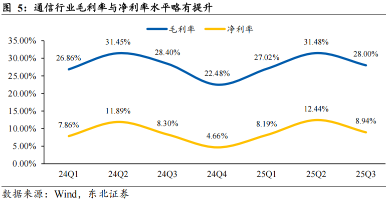 盈利能力较去年同期略有提升。2025年前三季度通信行业毛利率分别为27.02%/31.48%/28.00%,与去年同期相比略有提升;净利率分别为8.19%/12.44%/8.94%,较去年同期有所提升。整体来看,2025年受AI基础设施建设影响,通信行业盈利能力进一步改善。