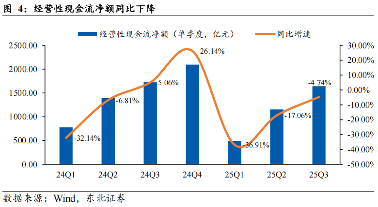 营收增速保持稳健,净利润水平高增。2025年前三季度,通信板块实现营业总收入1.95万亿元,同比增长3.22%。分季度来看,2025Q1-Q3分别实现营业收入6366.29/6854.36/6304.68亿元,同比增速分别为2.42%/3.54%/3.69%。净利润方面,近年来通信板块净利水平呈现明显的季节性,二季度利润较高,季度间利润水平波动较大; 25年前三季度净利润走势同样呈现明显季节性,第二季度利润达到高峰,前三季度分别同比增长6.69%/8.26%/11.68%,在AI基础设施建设稳步推进的情况下表现亮眼。经营性现金流方面,2025年前三季度经营活动产生的净现金流均同比下滑。分季度来看,2025Q1-Q3通信行业经营性净现金流同比降幅为-36.91%/-17.06%/-4.74%。