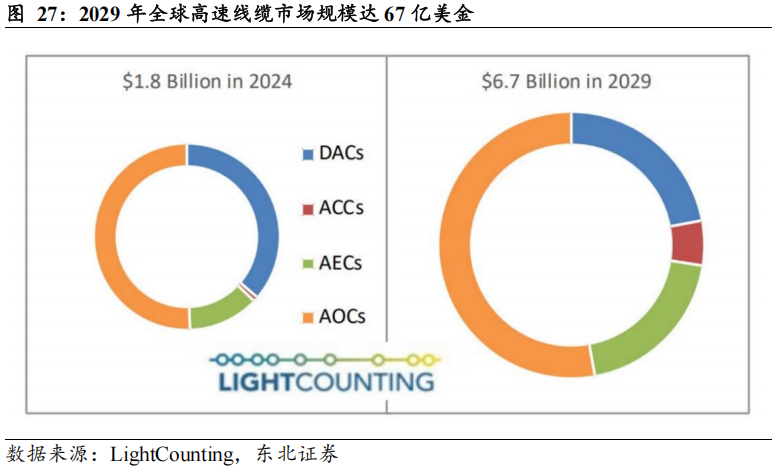 高速铜缆是目前算力中心机架内及机架间短距离互连的理想解决方案。展望未来,随着AI群集的快速部署,预期多通道800G、1.6T、3.2T及单通道224G、448G高速铜缆的需求将会上升。据LightCounting预测,2029年全球高速线缆(DAC+ACC+AEC+AOC)市场规模将达到67亿美元,预计到2027年底,年度出货量将突破2000万条大关。同时,有源电子电缆(AEC)将逐渐抢占无源直连铜缆(DAC)的市场份额。