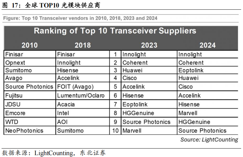 Vera Rubin进一步提升光模块配比。英伟达下一代Vera Rubin NVL144架构800G CX-9网卡,每个CX-9连接到一个后端网络的OSFP光模块接口。基于三层无收敛网络架构测算,对1.6T光模块的需求将从Blackwell的1:2.5提高到Vera Rubin的1:5。光模块行业马太效应明显,竞争格局仍然利好龙头。