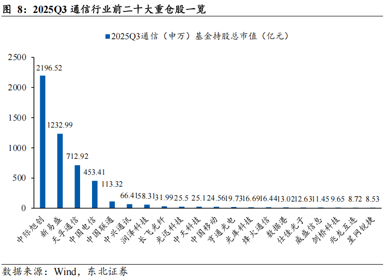 2025年通信板块热度较高。从基金持仓结果来看,截至2025年半年报,通信行业(申万一级)基金配置比例为3.86%,而行业标准配置比例为2.91%。整体来看,基金持仓前20名的公司集中于光模块、光器件、运营商等方向。其中,中际旭创、新易盛、天孚通信为前三大基金重仓股。