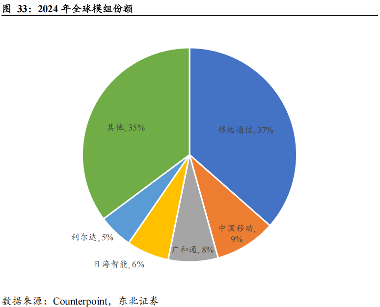 全球无线通信模组产业正经历着深刻的格局重塑,中国企业快速崛起。早期,以Telit、Sierra Wireless、Gemalto和U-Blox为代表的海外厂商凭借先发技术优势占据市场主导地位,2016年这四家国际巨头的合计出货量占比高达46%。然而,随着中国厂商的集体崛起,这一格局被快速改写。以移远通信、广和通为领军代表,配合通过并购实现快速扩张的日海智能(维权)(收购芯讯通)和高新兴(收购中兴物联),以及专注特定领域的有方科技等国内企业,展现出强劲的发展势头。近年来,国内厂商的模组业务营收增速持续显著超越海外同行,推动市场格局发生根本性转变。根据锐观咨询的追踪数据,到2018年,国际四强的市场份额已下滑至38%,而中国厂商则实现历史性突破,出货量市占率首次超过50%。根据Counterpoint 2024年第二季度数据显示,这一产业转移趋势仍在持续深化,国际四强的市场份额已下滑至16%,中国厂商凭借在5G、NB-IoT等新兴技术领域明显的领先优势进一步抢占全球市场份额,移远通信、广和通份额提升至36.5%、7.5%。"东升西落"的产业态势,不仅体现在市场份额的变化上,更反映在技术创新能力、成本控制水平和产业链完整度等多个维度,标志着全球通信模组产业已进入由中国企业主导的新发展阶段。