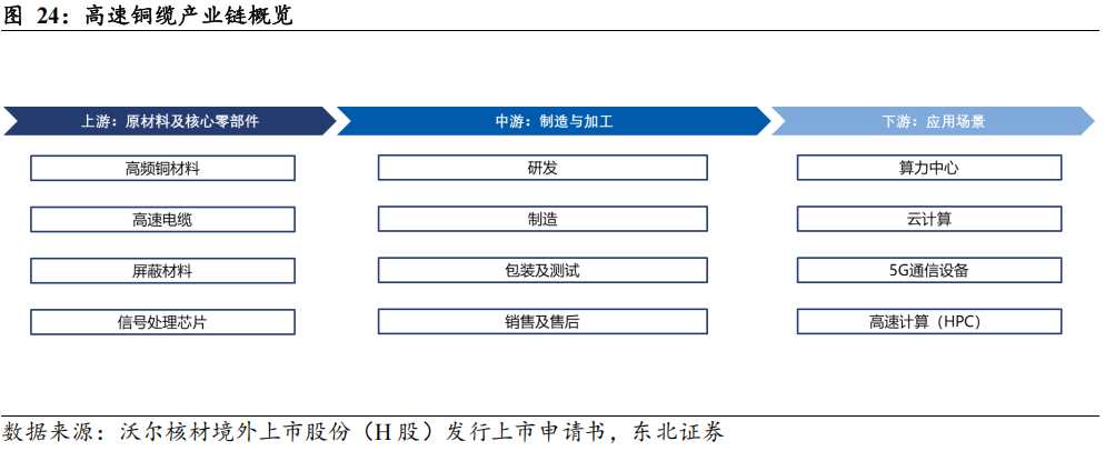 个完整且紧密相连的产业链体系。根据沃尔核材境外上市股份(H 股)发行上市申请书,高速通信电缆行业的上游板块主要涉及原材料及核心零部件的供应。中游板块主要集中在研发、制造及测试方面。在下游,高速通信电缆广泛应用于算力中心、云计算、高速计算(HPC)及5G 设备等领域。