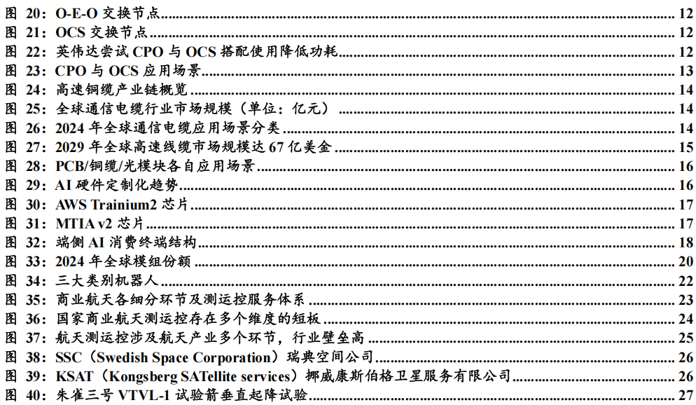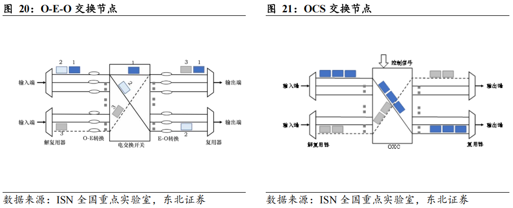 我们认为,基于电交换机与光交换机的不同特性,CPO与OCS有望在数据中心网络共存:传统电交换更适合流量动态变化大、需要频繁调整数据传输路径的场景;光交换技术更适合用在流量模式相对稳定、端口间映射关系明确且不用频繁切换的场景,避开切换时间长的短板。目前,OCS整体落地应用节奏领先于CPO。