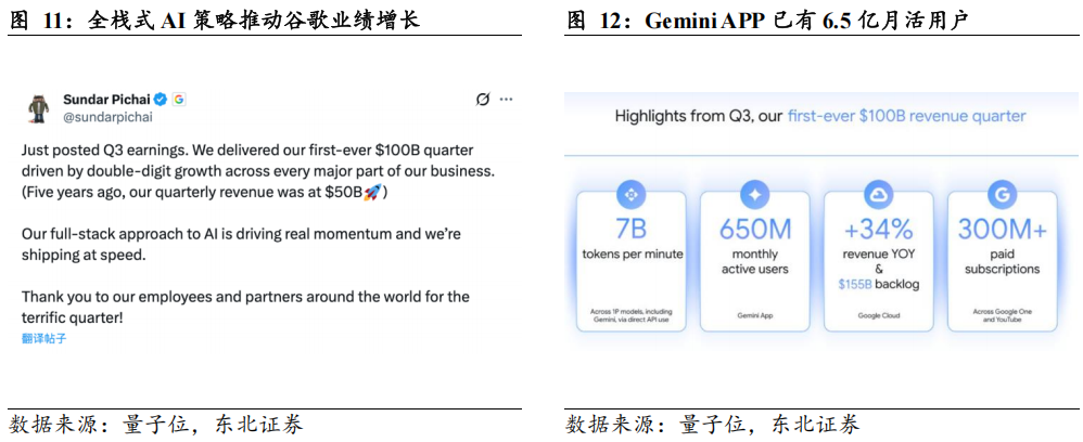 海外AI商业化闭环初步形成,AI赋能作用明显。以谷歌为例,在AI业务带动之下,谷歌2025三季度营收首次突破千亿美元,谷歌CEO表示全栈式AI策略推动了这一增长。谷歌AI业务已进入实质商业化阶段,形成了明确产品线和用户规模。Gemini大模型已通过API开放给开发者及企业客户,官方披露Gemini模型每分钟处理Token数量已达70亿,反映调用密度和商用落地广度。Gemini App作为面向C端用户的AI助手,全球月活跃用户数已达6.5亿人。另外,在广告业务中,生成式AI已被用于素材生成、搜索广告推荐和视频广告生成,谷歌称AI已“正向影响广告系统的每一部分”。