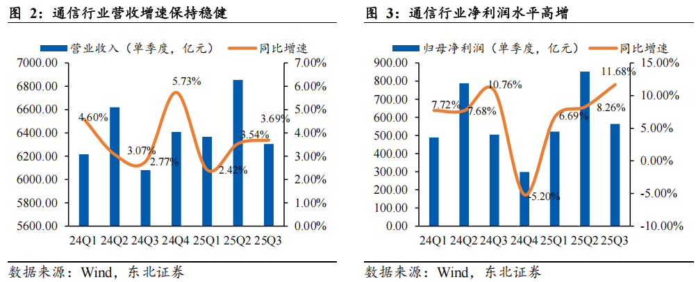 通信行业牛市进攻性明显,走势强于大盘。截至2025年11月7日,申万通信指数收盘报4,864.72点,年内累计收益率达63.37%,显著跑赢上证指数(19.27%)、深证成指(28.70%)和创业板指(49.80%)。全年来看,通信指数在4-5月份受中美关税冲突影响较为明显,7-8月表现突出,区间涨幅达48.86%,远超同期上证指数(12.01%)和深证成指(21.32%),超额收益显著。2025年前三季度,通信行业整体营收增速保持稳健,净利润水平高增,盈利能力较去年同期略有提升。通信板块年内估值提升明显,部分细分板块仍存在配置空间。