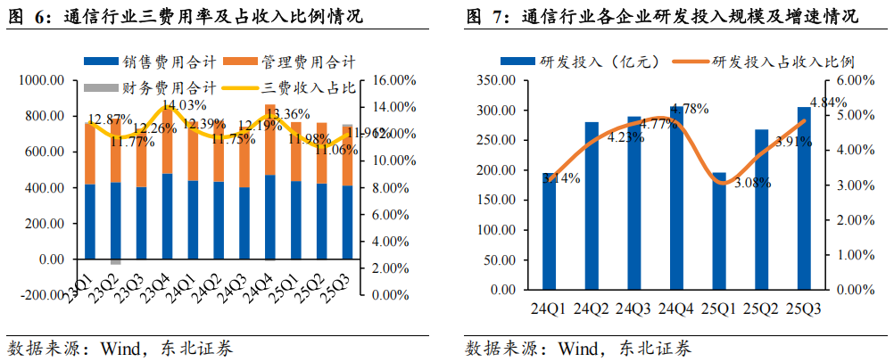 三费占比继续下降,研发投入相对稳定。2025年前三季度,通信行业三费占比分别为11.98%/11.06%/11.96%,维持近年来下降态势,销售及管理费用均有降低,行业公司不断优化内部管理降低成本提升盈利能力。从科研水平上看,2025年研发投入保持稳健,前三季度研发投入占比分别为3.08%/3.91%/4.84%,数据中心互连新技术、数字化转型、智能网联、物联网等快速发展驱动各公司提高研发投入,在产业变革中凭借科研水平提升核心竞争力。