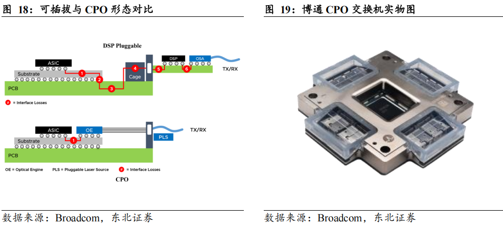 CPO共封装光学仍保留光电转换环节,是电交换机的新形态。CPO (Co-packaged optics)技术的核心是将交换芯片和光引擎共封装,大幅缩短两者之间的距离,以实现降低功耗、提升集成度、增加端口密度等效果。在CPO系统中,集成度更高的光引擎代替传统可插拔光模块发挥核心的光电转换功能,本质上仍属于电交换的范畴。