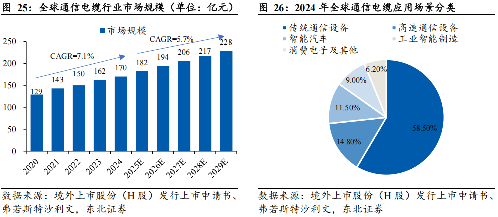 受数据流量扩张、基础设施升级及多样化应用场景的推动,全球通信电缆行业呈现稳步增长。2020年至2024年,全球通信电缆行业总收入由人民币129亿元增加至人民币170亿元,期间复合年增长率为7.1%,预计到2029年将达人民币228亿元,自2025年复合年增长率为5.7%。行业可按应用情景分类为传统通信设备、高速通信设备、智能汽车、工业智能制造以及消费电子产品及其他。2024年,传统通信设备依然占据主导地位,占总收入的58.5%。受AI服务器及算力中心对高速率、低迟延传输的需求不断上升所推动,2024年,高速通信设备占市场的14.8%,智能汽车、工业智能制造以及消费电子及其他分别占11.5%、9.0%及6.2%。