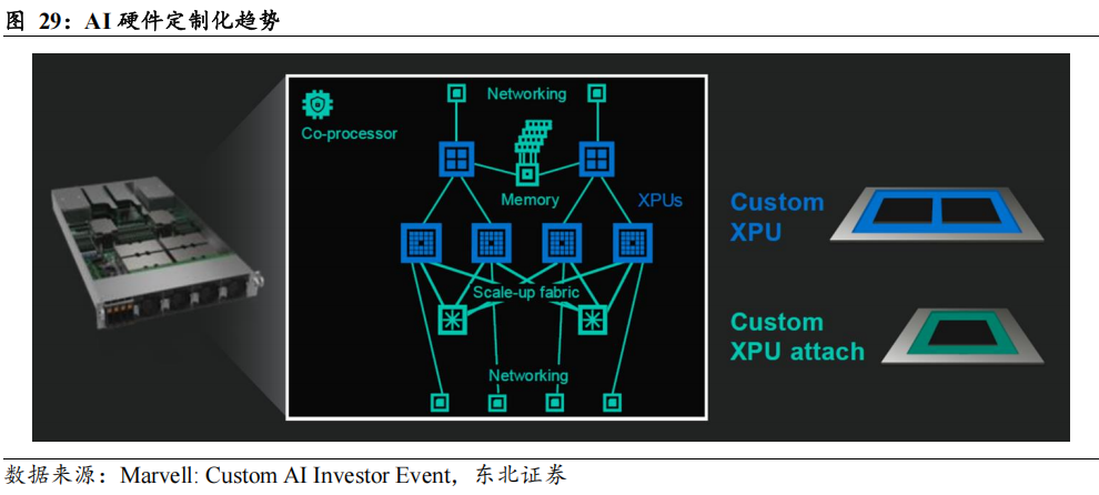 硬件异构解耦趋势明显,定制AI需求对应多样化互联方式。根据Marvell Custom AI Event的描述,AI硬件逐步进入全面定制时代,Marvell把定制化加速计算定义为XPU+XPU Attach,XPU Attach主要包括NIC/Scale-Up网络/安全和主机管理处理器/内存池化器/扩展器等。Marvell把XPU Attach的定制化分为四个阶段:通用→第三方(如NVLink Fusion)→标准化(如UALink)→全定制。我们认为,海外云厂商会结合自身训推需求,探索业务适配度最高的互联解决方案,不必用博弈的眼光看待个别厂商技术路线短期的修正或变更。