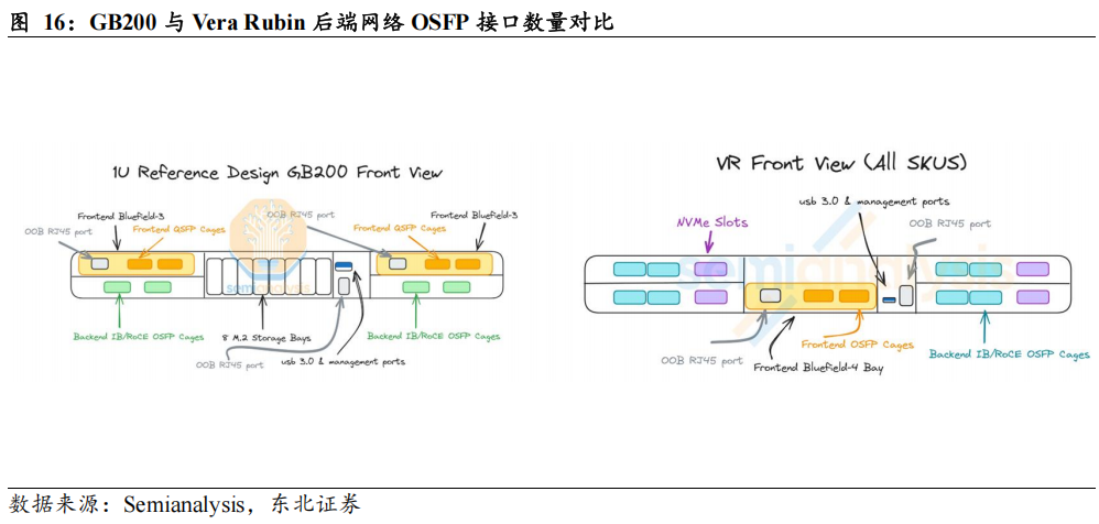 Vera Rubin进一步提升光模块配比。英伟达下一代Vera Rubin NVL144架构共包含18个compute tray(2*Vera CPU + 4*Rubin GPU),搭配8个800G CX-9网卡,每个CX-9连接到一个后端网络的OSFP光模块接口。基于三层无收敛网络架构测算,对1.6T光模块的需求将从Blackwell的1:2.5提高到Vera Rubin的1:5。据《联合报》报道,黄仁勋表示,下一代Rubin GPU已开始进入生产线。英伟达表示,Rubin GPU预计在2026年第三季度左右甚至更早进入大规模量产阶段。新一代Rubin GPU放量预计带来更多高速率光模块数量需求。