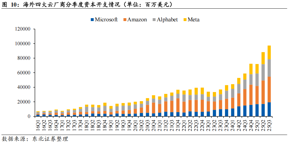 海外资本开支保持高位,算力高景气周期延续。云厂商资本支出继续增长,2025年前三自然季度,北美四大云厂商微软、谷歌、Meta、亚马逊资本开支合计为719.32/882.46/972.71亿美元,同比增速分别为62.4%/67.0%/65.3%。