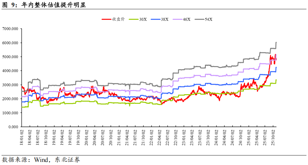 牛市进攻性明显,走势强于大盘。截至2025年11月7日,申万通信指数收盘报4,864.72点,年内累计收益率达63.37%,显著跑赢上证指数(19.27%)、深证成指(28.70%)和创业板指(49.80%)。全年来看,通信指数在4-5月份受中美关税冲突影响较为明显,7-8月表现突出,区间涨幅达48.86%,远超同期上证指数(12.01%)和深证成指(21.32%),超额收益显著。