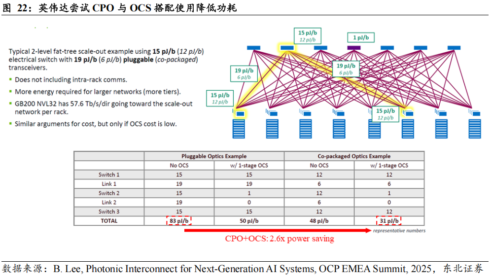 英伟达尝试CPO与OCS搭配使用,功耗降低效果明显。在2025年4月召开的OCP EMEA SUMMIT,英伟达首席科学家Benjamin Lee分享了AI数据中心CPO与OCS搭配使用的方案。在二层Fat-tree网络中,对比了可插拔、可插拔+OCS、CPO、CPO+OCS四种组合的功耗表现。经测试,四种方案的总功耗分别为83 pJ/b、50 pJ/b、48 pJ/b、31 pJ/b,引入OCS可将数据中心网络功耗降低30%-40%,相较于传统可插拔方案,CPO+OCS的组合可降低2.6x的功耗。