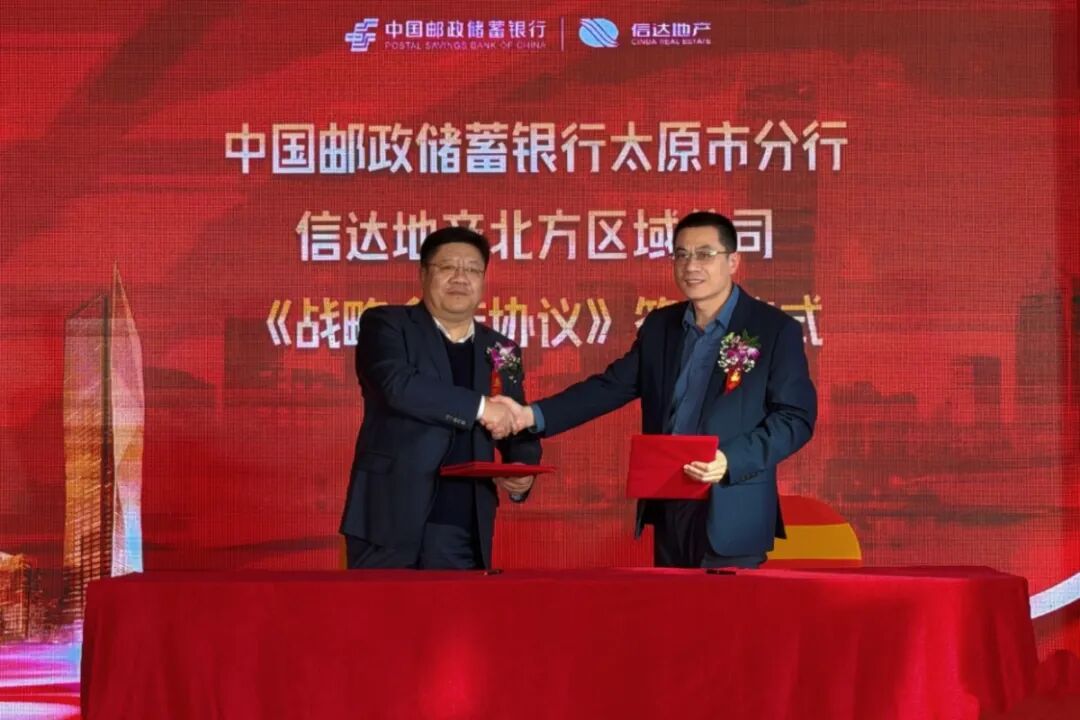 随后,丁辉和顾君分别代表信达地产北方区域公司、中国邮政储蓄银行太原分行签署《战略合作协议》,双方将充分发挥各自优势,在房地产贷款业务、纾困基金业务、供应链金融合作、社区金融服务等领域开展密切合作,共同构建金融与地产融合新生态,实现资源共享,业务创新,合作共赢,为行业与经济的行稳致远贡献力量。