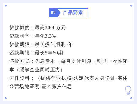 最高额度3000万,年化利息低至3.36%,最长可贷5年,最快7-12天放款,帮企业快速解决资金难题!