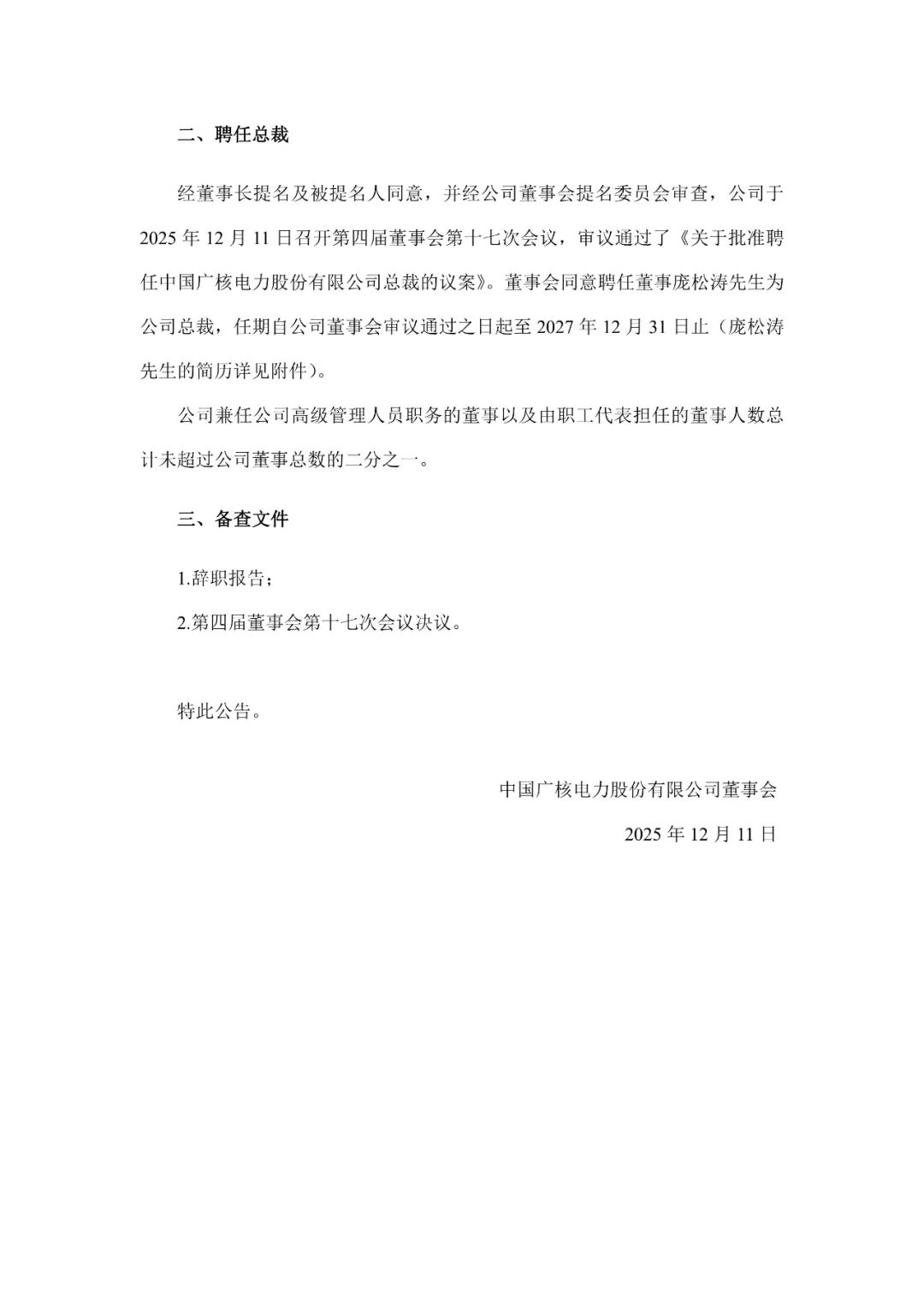 经董事长提名及被提名人同意,并经公司董事会提名委员会审查,公司于2025年12月11日召开第四届董事会第十七次会议,审议通过了《关于批准聘任中国广核电力股份有限公司总裁的议案》。董事会同意聘任董事庞松涛先生为公司总裁,任期自公司董事会审议通过之日起至2027年12月31日止。