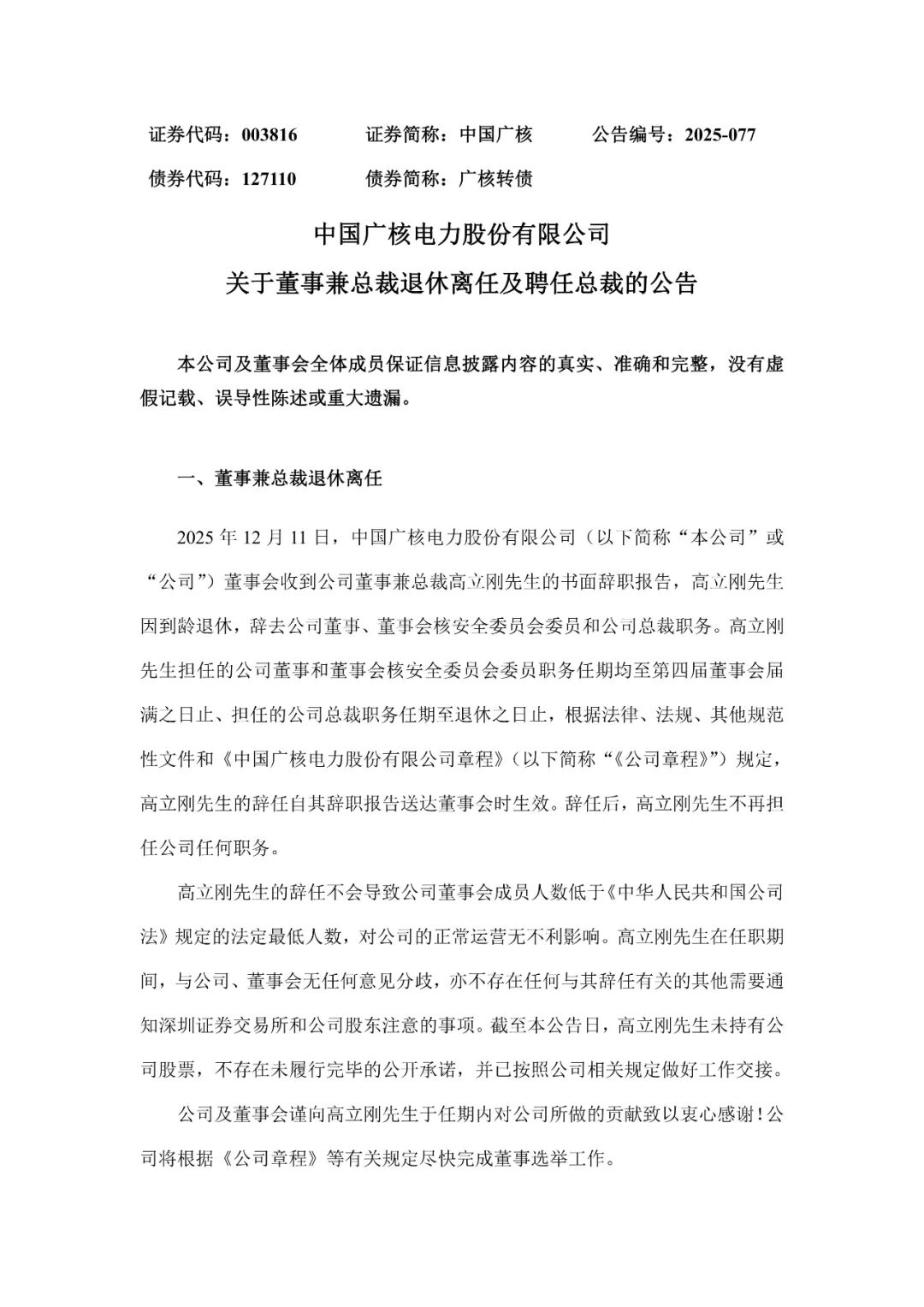 公告指出,2025年12月11日,中国广核电力股份有限公司(以下简称“本公司”或“公司”)董事会收到公司董事兼总裁高立刚先生的书面辞职报告,高立刚先生因到龄退休,辞去公司董事、董事会核安全委员会委员和公司总裁职务。