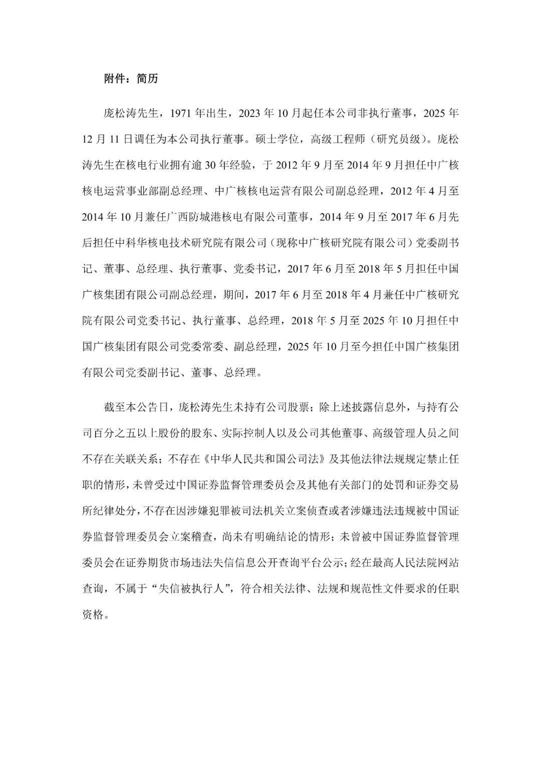 庞松涛,男,1971年出生,硕士学位,高级工程师(研究员级)。2023年10月起任本公司非执行董事,2025年12月11日调任为本公司执行董事。庞松涛先生在核电行业拥有逾30年经验,于2012年9月至2014年9月担任中广核核电运营事业部副总经理、中广核核电运营有限公司副总经理,2012年4月至2014年10月兼任广西防城港核电有限公司董事,2014年9月至2017年6月先后担任中科华核电技术研究院有限公司(现称中广核研究院有限公司)党委副书记、董事、总经理、执行董事、党委书记,2017年6月至2018年5月担任中国广核集团有限公司副总经理,期间,2017年6月至2018年4月兼任中广核研究院有限公司党委书记、执行董事、总经理,2018年5月至2025年10月担任中国广核集团有限公司党委常委、副总经理,2025年10月至今担任中国广核集团有限公司党委副书记、董事、总经理。