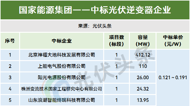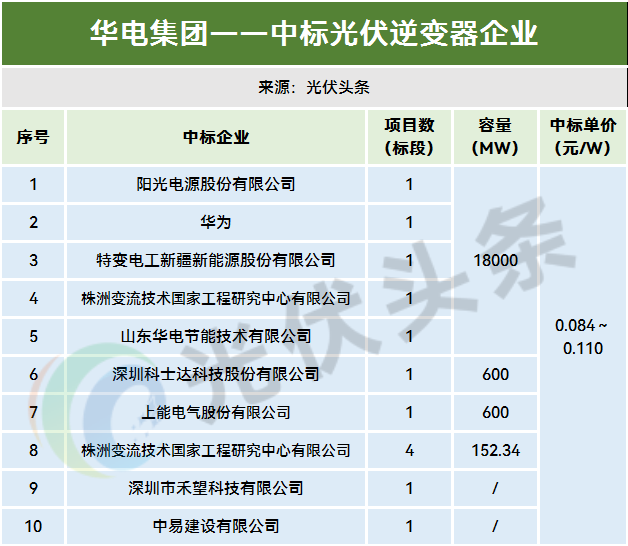 华电集团18GW逆变器集采项目确定中标人,阳光电源、华为、特变电工、中车时代电气(株洲变流)、山东华电节能技术有限公司等5家企业成为最大赢家,合计赢得18GW订单。