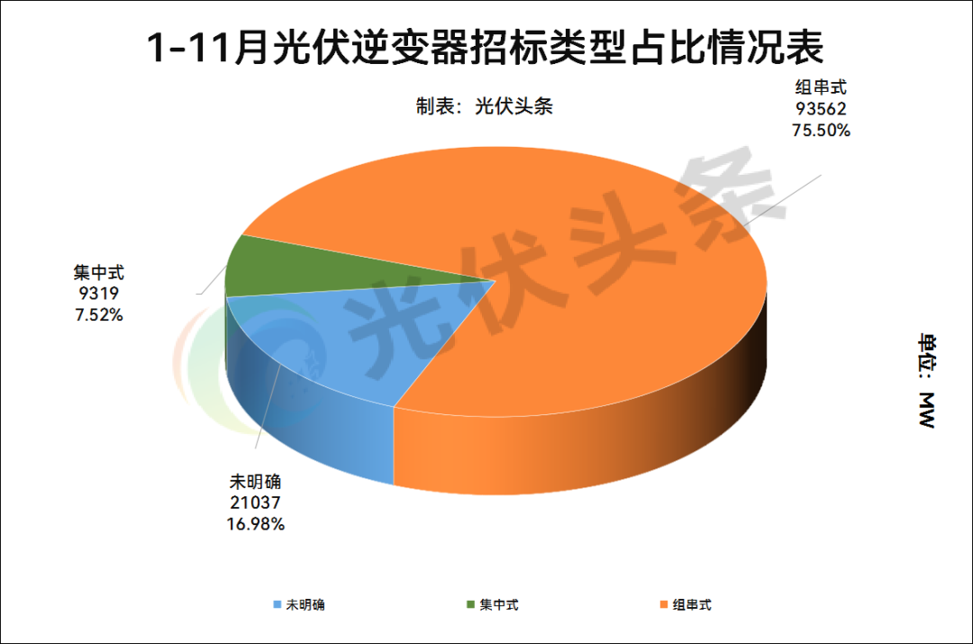 5、在技术路线上,1-11月定标的光伏逆变器项目之中,组串式逆变器合计容量163.38GW,占比达到76.45%。