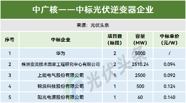 1月3日,中广核新能源2025年度光伏逆变器设备框架集采项目公示中标人。华为、上能电气、中车时代电气(株洲变流)、锦浪科技等4家企业成为最大赢家,合计赢得10.5GW订单。此外阳光电源赢得中广核60MW单独招标项目。