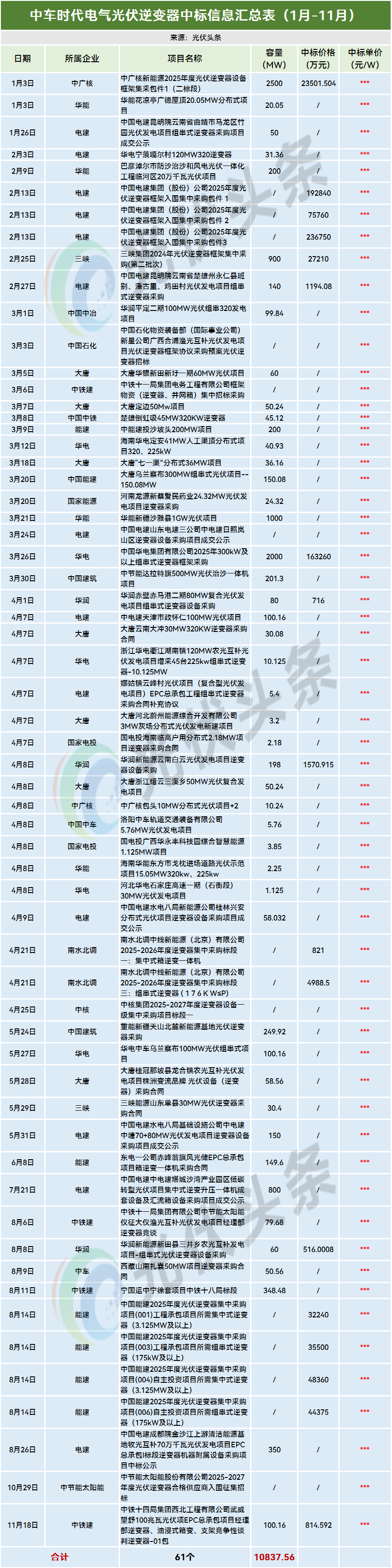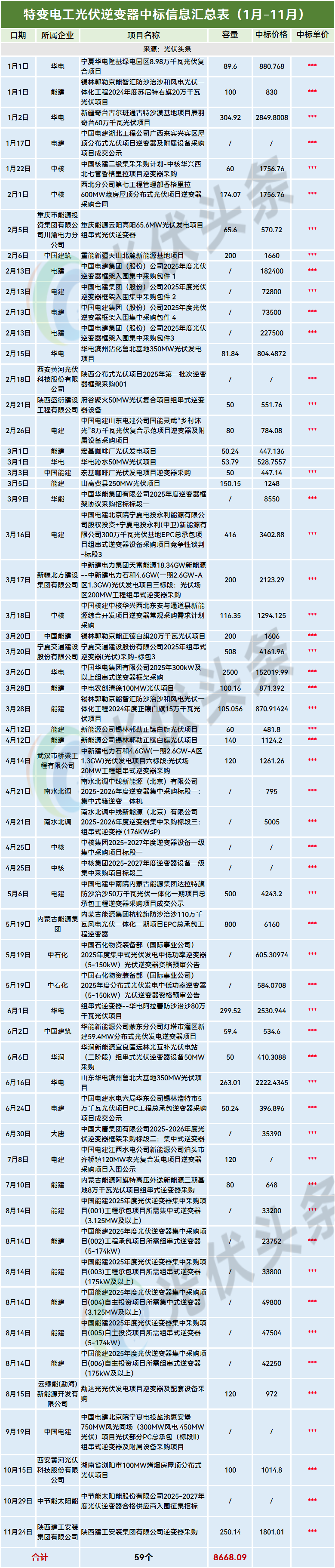 光伏头条根据公开信息统计,2025年1-11月,央国企约309个光伏逆变器招标项目,合计容量约123.92GW。