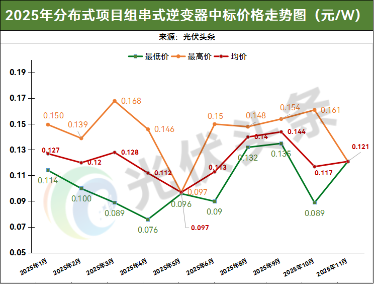 具体来看,11月分布式项目组串式逆变器均价0.121元/W,与10月0.117元/W相比,上涨3.42%。