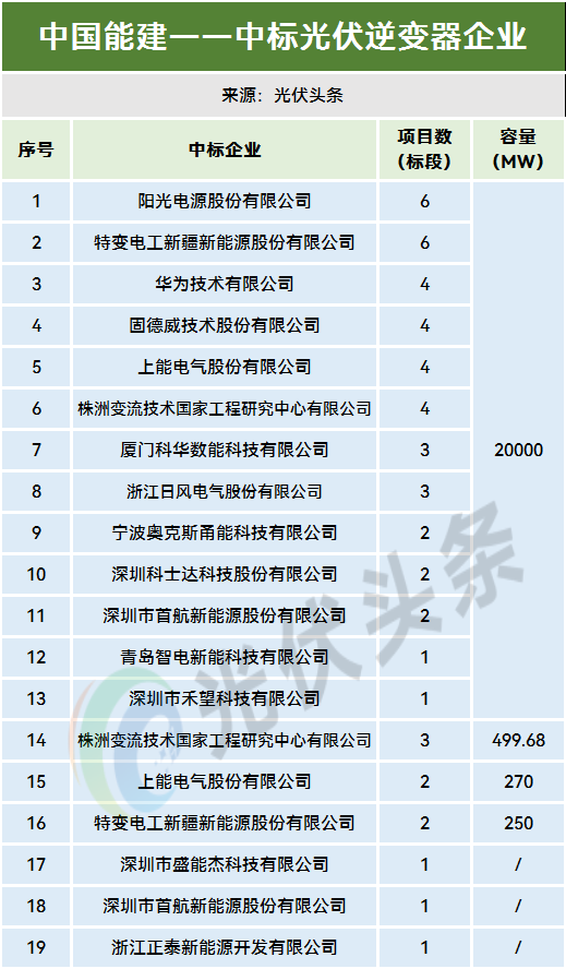中国能建有16个项目定标,合计容量21.81GW。8月14日,中国能建20GW逆变器集采项目定标,阳光电源、特变电工、华为、固德威、上能电气、中车时代电气(株洲变流)、科华数能、科士达、首航新能、禾望电气等13家企业中选。