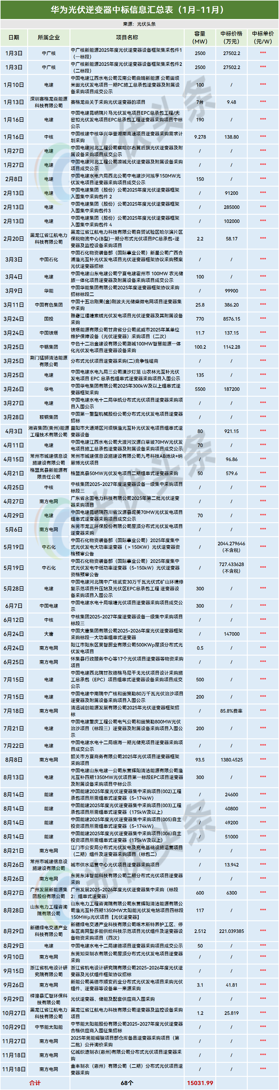 本统计周期,华为表现出色,位列中标榜第二名,中标中广核、电建、能建、中核、中国有色集团、中国石化、华能、国投、华电、中铝集团、鞍钢集团、南方电网、大唐、中节能等企业68个项目(标段),确定中标容量15.03GW。