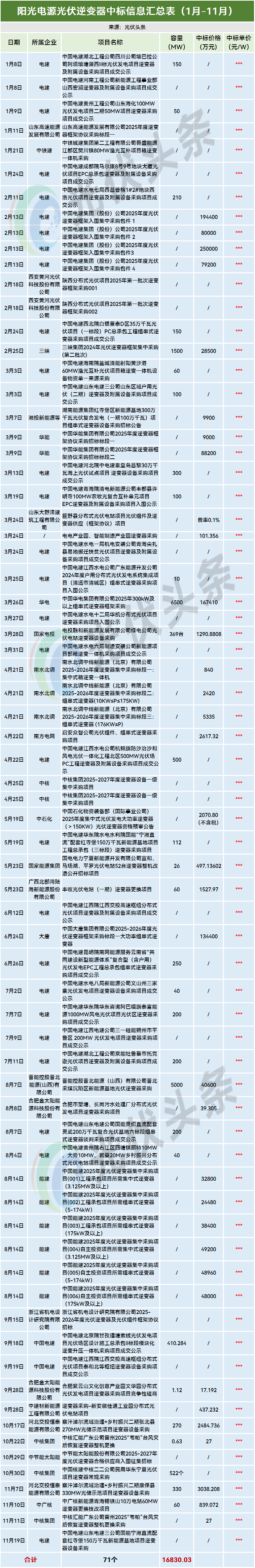 光伏头条根据公开信息统计,1-11月光伏逆变器定标容量为213.73GW。在本统计周期,有7个逆变器集采大单定标: